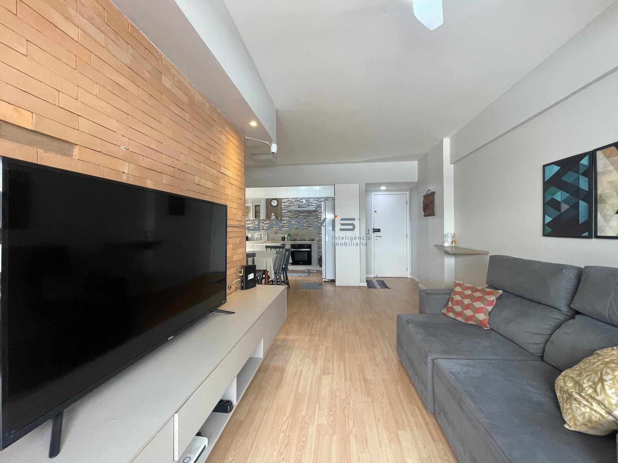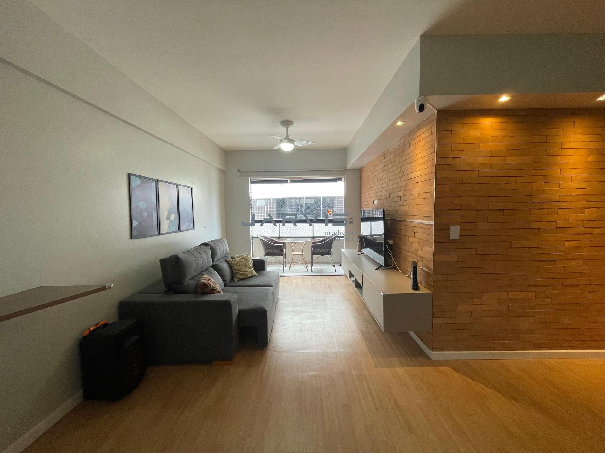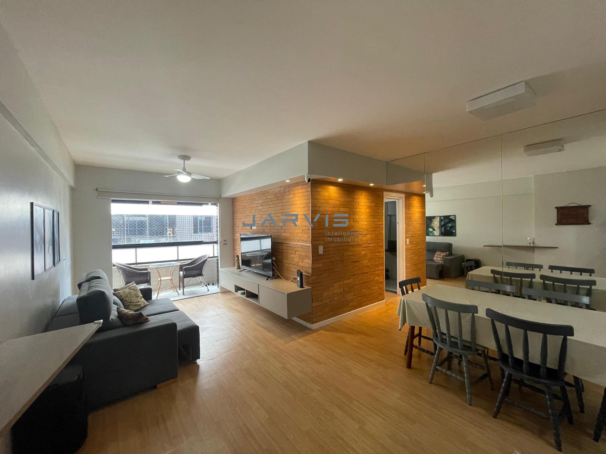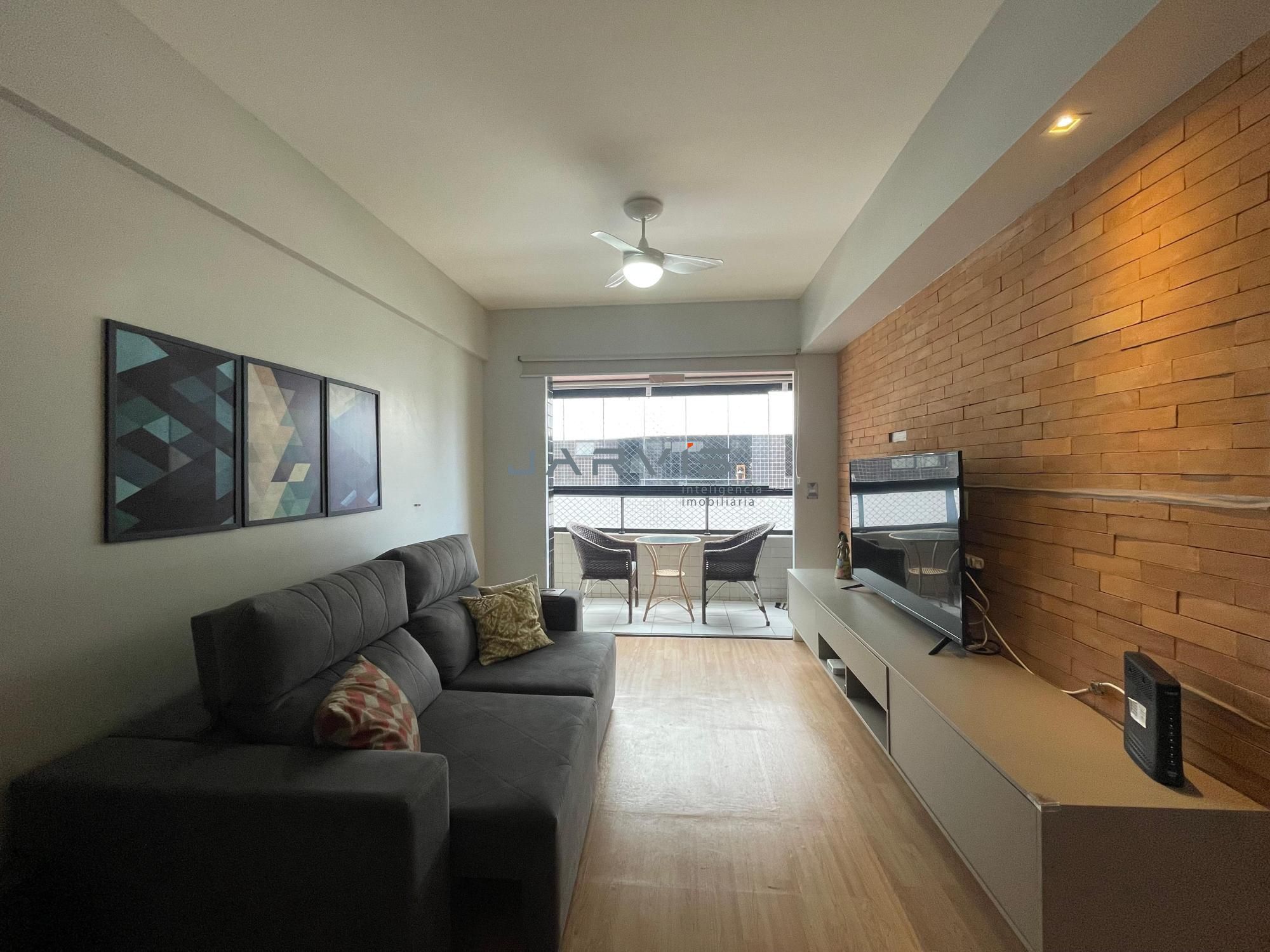 – Sala espaçosa com design elegante, parede em tijolinhos e iluminação planejada;